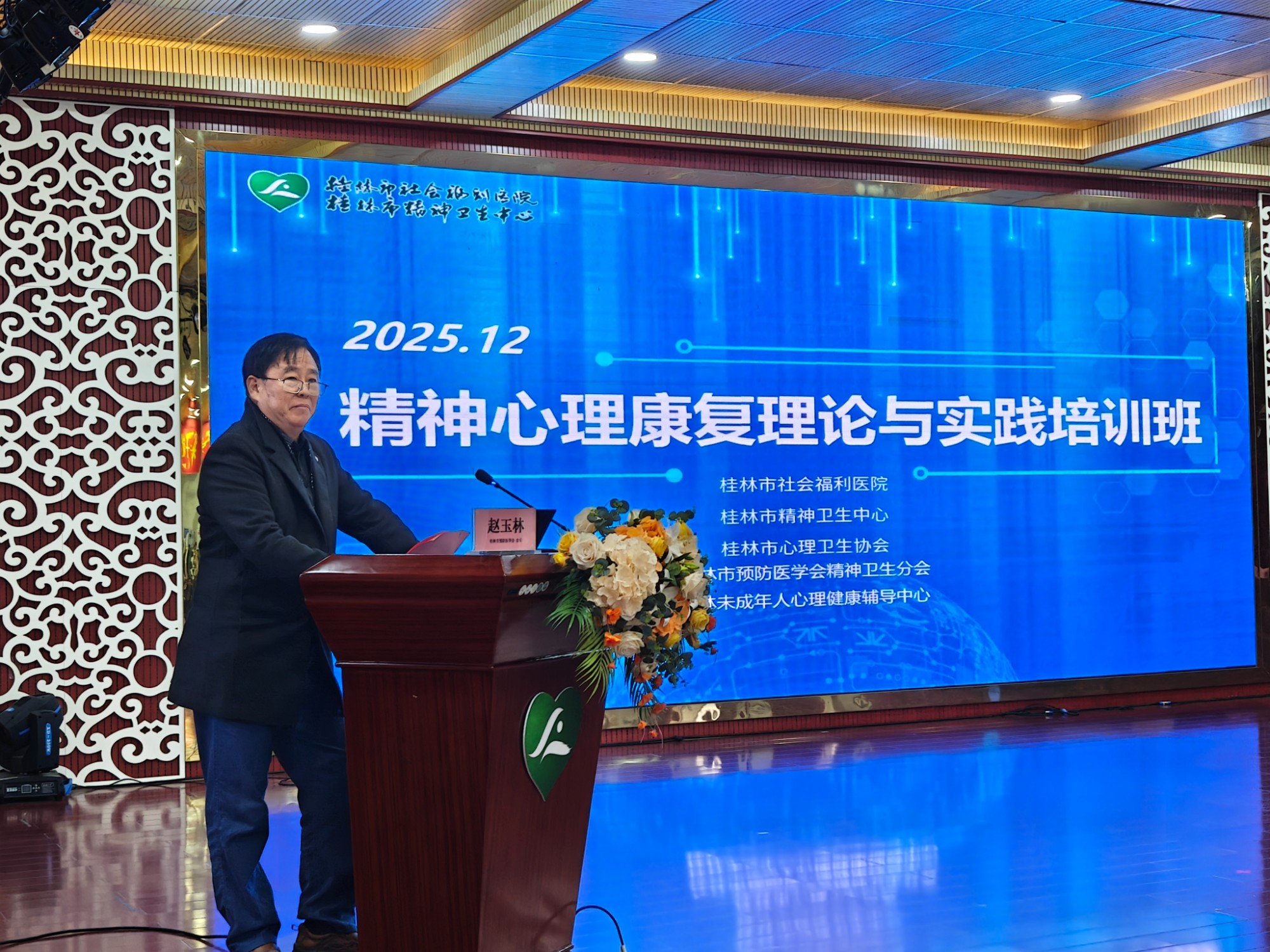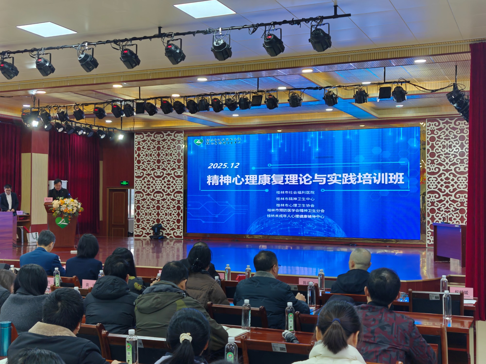 为积极响应国家“健康中国”战略部署,落实 2025 - 2027 年“儿科和精神卫生服务年”专项行动要求,进一步提升区域精神心理康复服务的专业化、规范化水平,12 月 13 日至 14 日,由桂林市心理卫生协会、桂林市精神卫生中心(桂林市社会福利医院)、桂林市预防医学会精神卫生分会联合主办的精神心理康复理论与实践培训班在桂林市社会福利医院顺利举行。此次培训吸引了来自医疗机构、社区卫生服务中心、学校及社会机构的临床医护人员、精防工作者、心理教师等250 余名专业人士踊跃参与,共同开启了一场精神卫生领域的知识探索之旅。