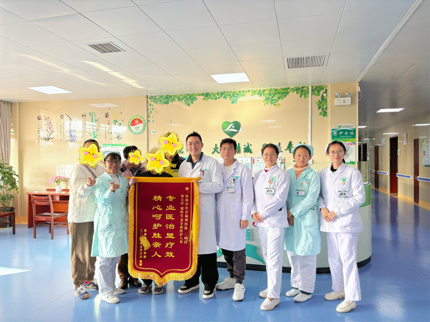 家属目睹老人病情日渐好转,愁容散尽,喜上眉梢。为表达心中的感激之情,他们特地定制写有“专业医疗显疗效,精心呵护胜亲人”的锦旗送到科室,紧紧握着医护人员的手,连声道谢。一位家属激动地说:“是你们给了老人第二次生命,让我们这个家又充满欢声笑语。”