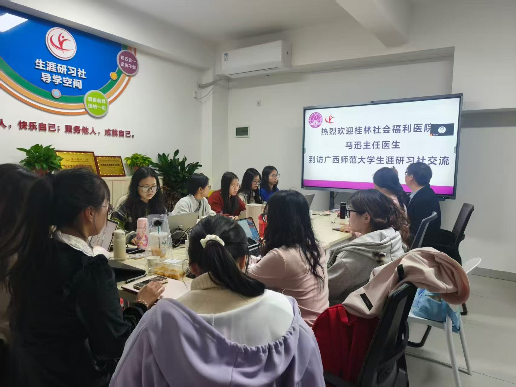 本次活动特邀桂林市社会福利医院主任医师马迅作为主讲嘉宾,与广西师范大学陈宛玉教授带领的应用心理学研究生团队展开深入交流。