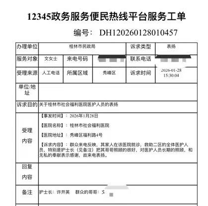 近日,桂林市政务服务便民热线接到表扬电话。市民文女士在电话中对桂林市社会福利医院救助二区全体医护人员的悉心照料表达了由衷感激,尤其对护士长许开英的专业尽责与暖心关怀赞誉有加。这通跨越距离的致谢,如一股暖流浸润人心,既照亮了医院救助工作的温情底色,更彰显了医患之间彼此信赖、双向奔赴的深厚情谊。