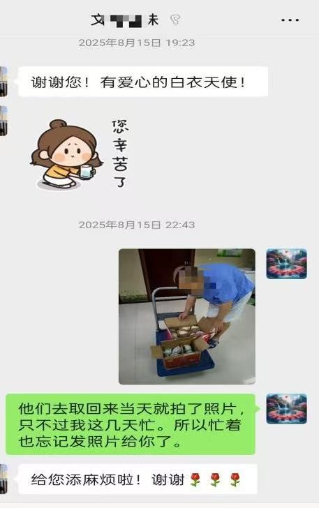 深知患者家属远在外地的牵挂,许开英主动承担起“沟通桥梁”的责任,定期通过电话、微信与文女士详细沟通,将患者的病情变化、治疗进展、饮食作息等情况一一告知,及时解答家属的疑问,让文女士虽隔千里却能“全程了解”哥哥的状况。不仅如此,当文女士每月通过网购为哥哥寄送水果、零食、鞋袜等物品时,许开英总会带领护士们及时前往驿站取回,细心协助患者拆封整理,还特意拍下照片发给文女士,让她直观看到哥哥收到物品的模样,彻底放下牵挂。当患者念叨想吃卤菜粉或需要加餐时,医护人员也会记在心上,及时满足需求;节假日与患者生日时,这份贴心关怀更是从未缺席。