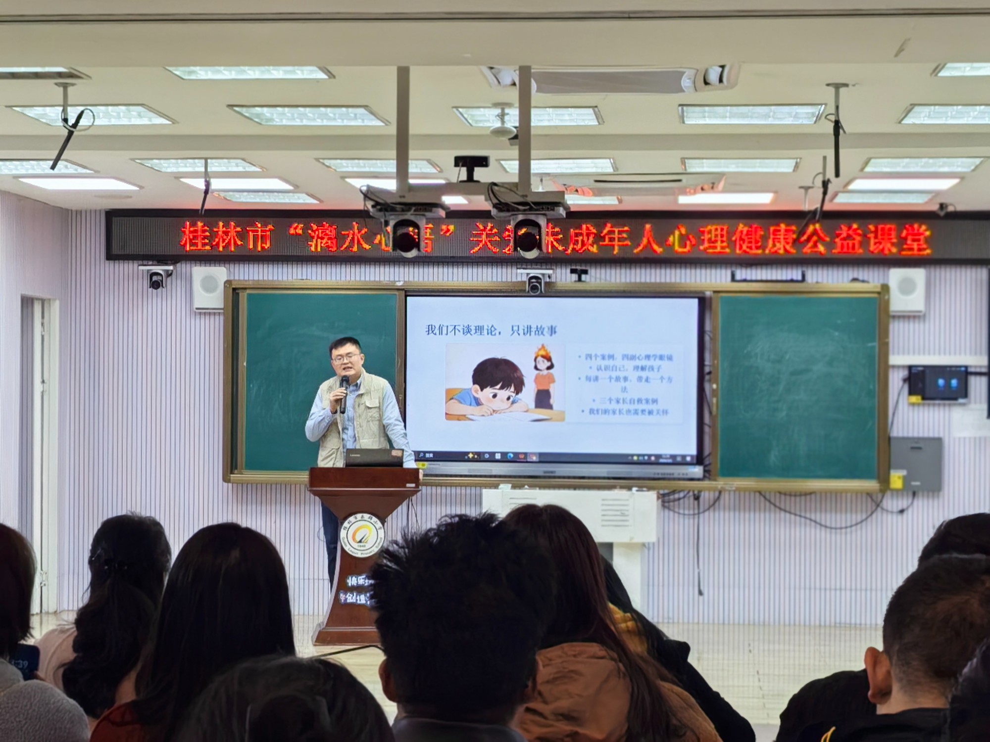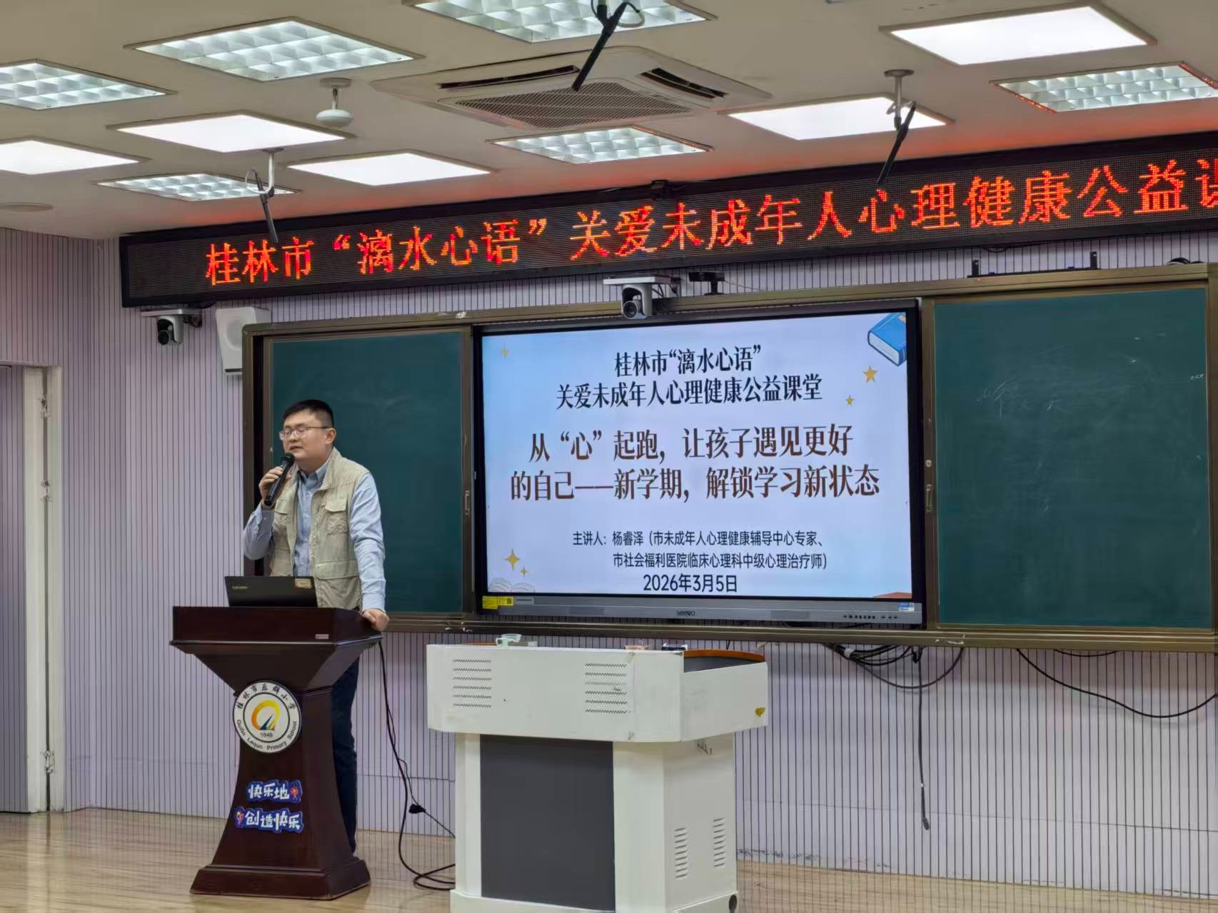 为积极响应未成年人心理健康关爱行动,助力新学期学生以良好身心状态开启求学新程,近日,由市文明办、市教育局、市民政局主办,市未成年人心理健康辅导中心、秀峰区文明办、秀峰区教育局、桂林市社会福利医院(桂林市精神卫生中心)共同承办的桂林市“漓水心语”未成年人心理健康公益课堂,在桂林市乐群小学暖心开讲。