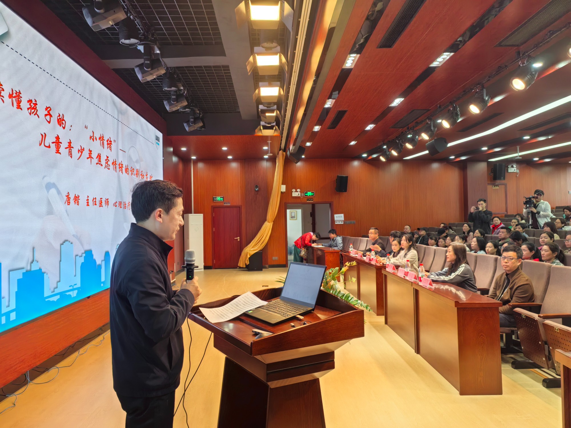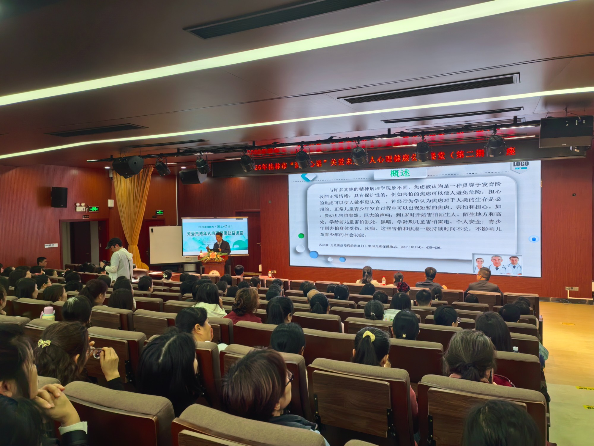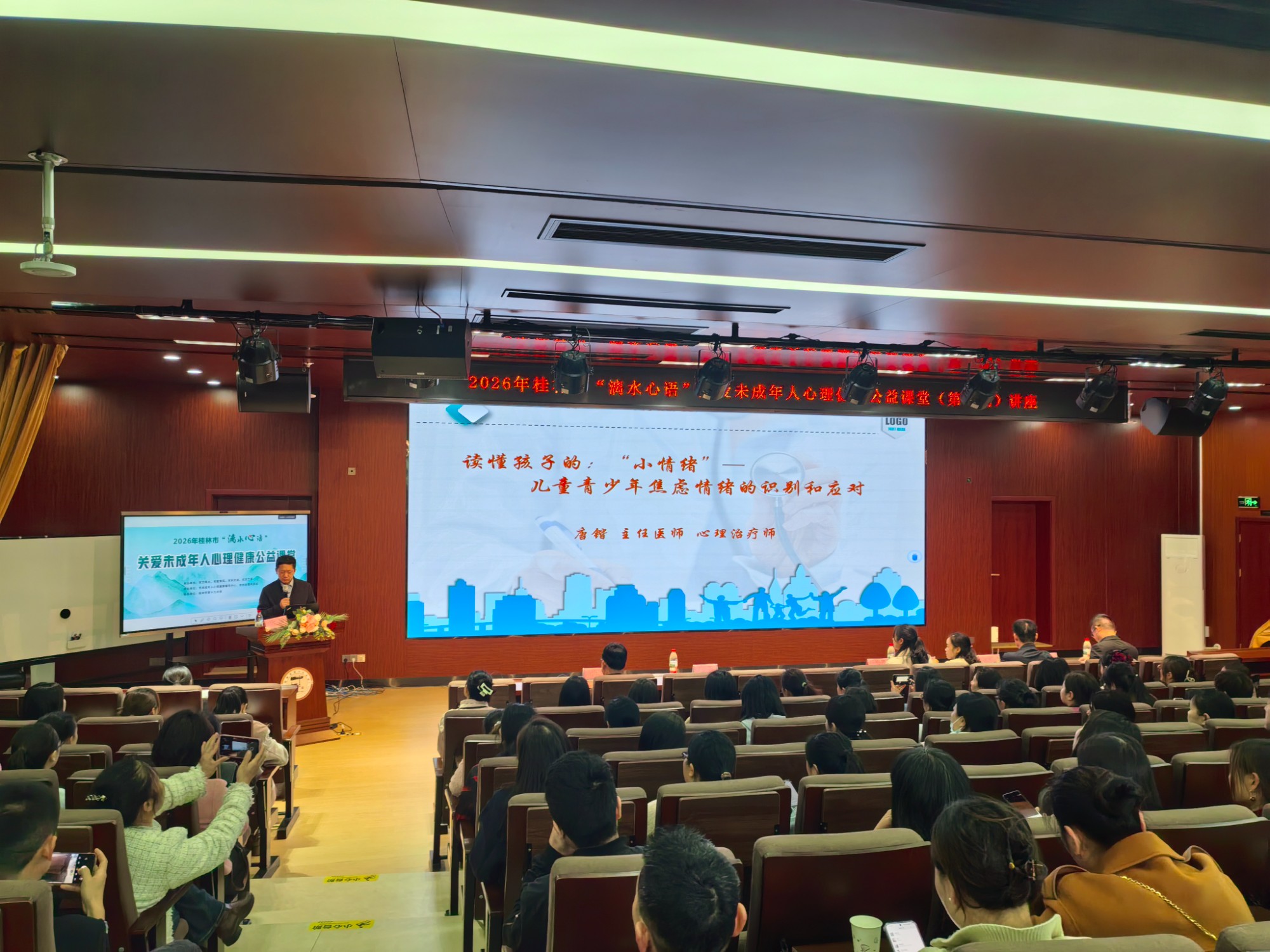 作为承办单位,桂林市社会福利医院高度重视此次公益活动,精心选派精神科大科主任、主任医师唐锴担任主讲嘉宾。唐锴凭借深厚的精神心理专业功底、多年临床诊疗与科普宣讲实践经验,围绕青少年焦虑情绪常见表现、深层成因、早期精准识别方法、科学应对干预策略等核心内容,开展深入浅出、通俗易懂的专业讲解,为现场家长、教师带来兼具专业性与实用性的心理指导。